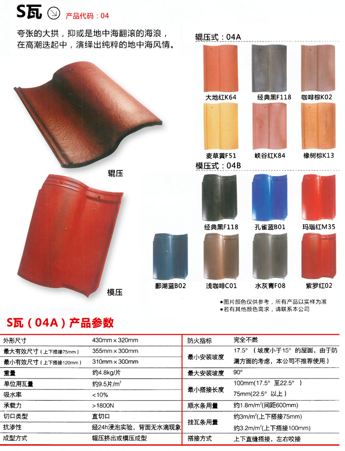 材料。先分辨著色層是混凝土還是漆料。混泥土彩瓦上色方式有二;其一:彩瓦著色層是混凝土與有機顏料、環氧樹脂及二氧化硅石料所組成,薄厚在0.5毫米上下。它粘合力強(與瓦另外制做)耐老化一般,歷經一定階段的風吹日曬非常容易退色。舊式制瓦和中小型瓦廠絕大多數用這類方式上色,緣故是低成本;其二:選用漆料噴漆,噴漆上色艷麗,一般噴漆干膜薄厚約在35um之上,經歷十數年的應用,久不掉色不脫落。