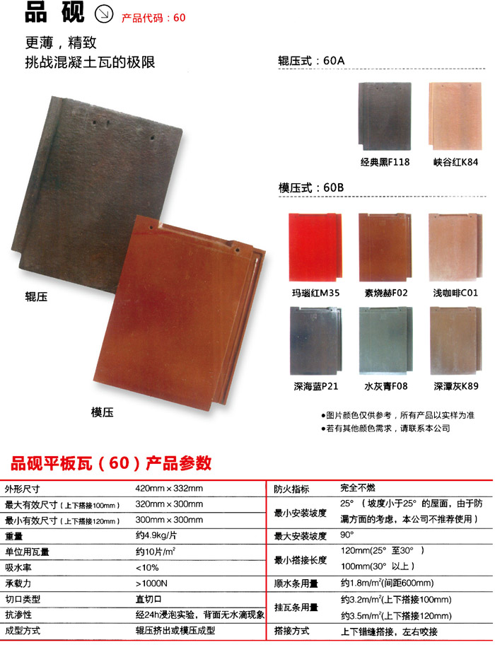 材料。先分辨著色層是混凝土還是漆料。混泥土彩瓦上色方式有二;其一:彩瓦著色層是混凝土與有機顏料、環氧樹脂及二氧化硅石料所組成,薄厚在0.5毫米上下。它粘合力強(與瓦另外制做)耐老化一般,歷經一定階段的風吹日曬非常容易退色。舊式制瓦和中小型瓦廠絕大多數用這類方式上色,緣故是低成本;其  二:選用漆料噴漆,噴漆上色艷麗,一般噴漆干膜薄厚約在35um之上,經歷十數年的應用,久不掉色不脫落。